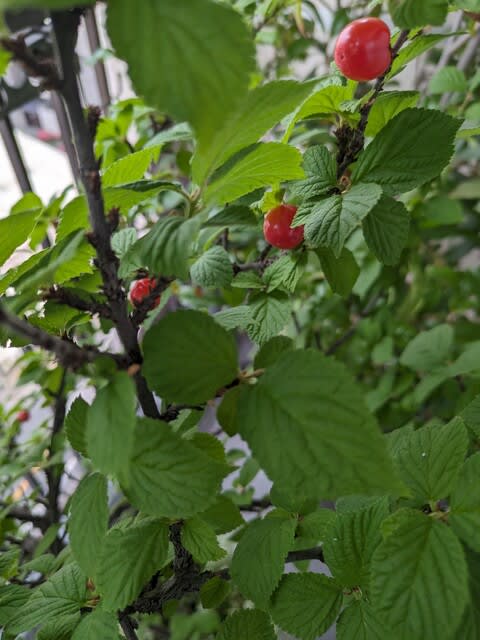 2024-05-20 山桜桃梅の実がなった。 日記 桜より少し早い3月に咲いて、5月で実になる。今年は花も減ったが、実になるのも少なかった。そろそろ鉢植えなので土替えをする必要があるのかもしれない。カメムシの死骸があったので根から吸収する殺虫剤(アース製薬のオールスター)を撒いてみた。すでに実にはカメムシに吸われた傷があったので少しは効果を期待したが、その後の一週間で一匹の死骸しかなかった。まあカメムシへの殺虫効果は記載されていなかったので当然なのだがただ実は雀が今年も食べていて、早々に回収しなければならない。
