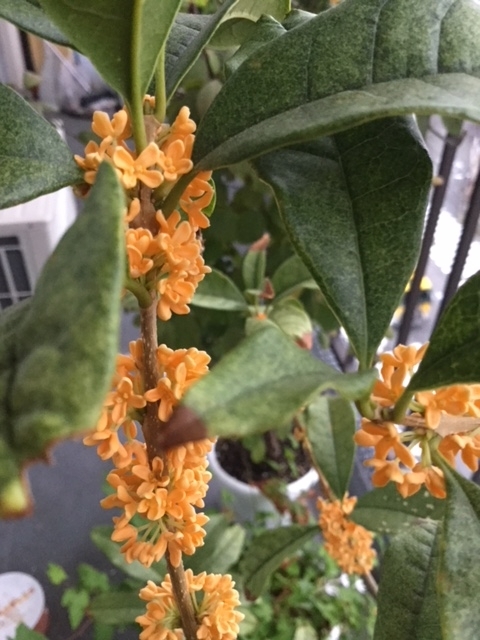 2017-10-16 秋の知らせは金木犀 金木犀の花が咲いた。 金木犀を鉢植えにした際,丈夫そうな葉が全部落ちて,ひ弱そうな葉に変わった。以来肥料を続けて投入。今年は花が咲かないと思っていた。 9月ころから緑色の芽が枝に沢山付いた。新しい葉が出ると期待していたが,10月になって一斉に芽が花になった。 秋色の花が綺麗だ。香りは薄い。でも秋だ。!! ただ葉っぱはどんどん少なくなる。最後の一花じゃないだろうな。