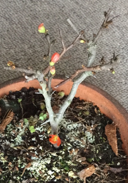 2023-01-29 長寿梅がやっと開花 去年の12月11日に我が家にやってきた長寿梅。着いた時は枝に蕾のような物が、接着剤でくっ付けたように一つ付いていただけだった。結局開くこともなく萎んでいった。一ケ月かかってやっと芽が出て、葉より先に花が開いた。しかし開くまで長くかかった。長寿梅だから?まあ寒いせいだとは思う。陽が出たときは必ず出して温めても長かった。これで春の山桜桃梅、夏の百日紅、秋の金木犀に続いて冬の長寿梅で四季咲き揃ったな。